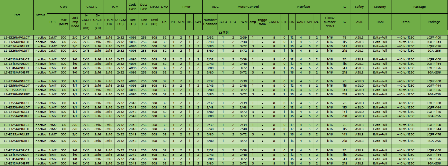 E3x系列是览山中高性能MCU产品序列,适用于车身控制, 集成热管理,座舱、T-BOX,EPB,VCU, BMS 等各种应用。